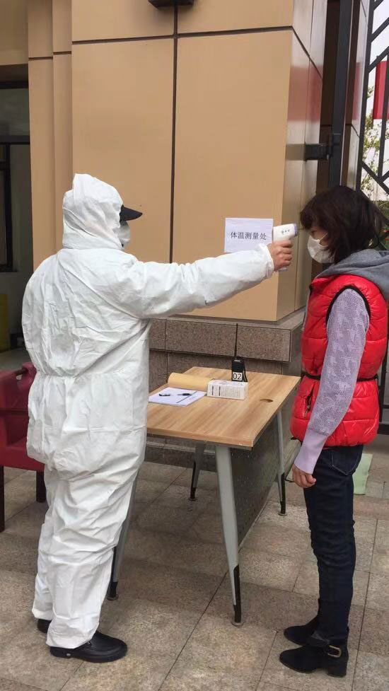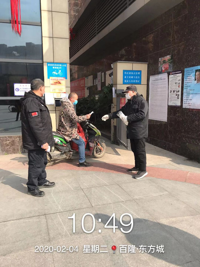 為有效抵御疫情,將風(fēng)險隔離在家園防線之外,公司對在管小區(qū)嚴(yán)格實行嚴(yán)格管理,嚴(yán)控人員和車輛進(jìn)出,尤其是外來人員和車輛進(jìn)入小區(qū)。秩序維護(hù)員每天堅守在小區(qū)出入口,拿額溫槍一個個測量出入人員體溫,不斷提醒住戶“外出戴口罩,回家勤洗手”,同時做好巡邏看護(hù)、定點值守等日常安管工作。