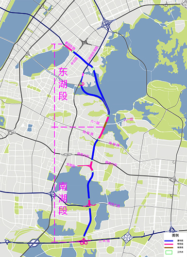 兩湖隧道是世界規(guī)模最大城市湖底隧道,隧道下穿東湖、南湖,既順接過江交通,又分擔二環(huán)線交通壓力,武昌中心城區(qū)將迎來又一條南北向骨干快速通道。工程北接秦園路和東湖路,南連三環(huán)線,全長約19公里,為小汽車專用道路,設(shè)計車速50公里/小時。采用“隧-路-隧”總體建設(shè)方式,以地下隧道為主。在卓刀泉北路設(shè)置地面段,以此為界,分為東湖段和南湖段。隧道內(nèi)設(shè)計為上、下兩層,分別行駛不同方向車輛。