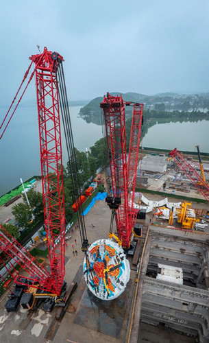 清晨7時許,涂裝了“龍鯉入漢”圖案的巨型刀盤在1臺800噸履帶吊和1臺450噸履帶吊的精準配合下順利翻身。兩臺履帶吊車如同兩個“大力士”,合力架著重達613噸的盾構機刀盤緩緩移動,進行起吊前的最后調試工作。在歷經起吊、翻身、旋轉等一系列操作后,下午1時30分左右,“東湖號”盾構機刀盤安全、精準地吊裝至井下安裝。
