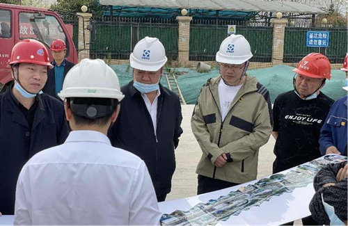 橋建集團(tuán)董事長(zhǎng)艾詩(shī)明、總經(jīng)理梅建松查看武金堤北段項(xiàng)目全線(xiàn)圖