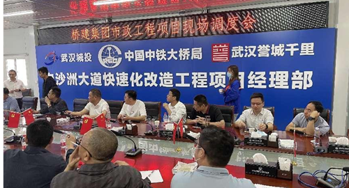 橋建集團(tuán)公司領(lǐng)導(dǎo)在白沙洲快速化項(xiàng)目現(xiàn)場(chǎng)召開(kāi)調(diào)度會(huì)