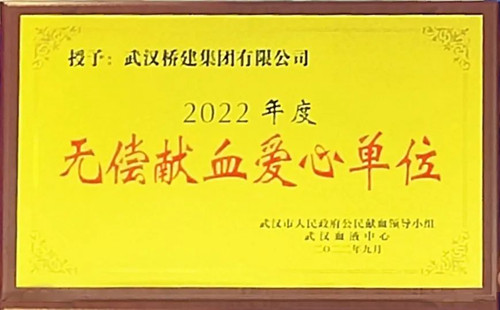 武漢血液中心授予公司“無償獻(xiàn)血愛心單位”榮譽(yù),感謝橋建集團(tuán)公司精心組織無償獻(xiàn)血公益活動(dòng),為患者帶去生的希望,為武漢市疫情防控和疾病救治作出了貢獻(xiàn)。