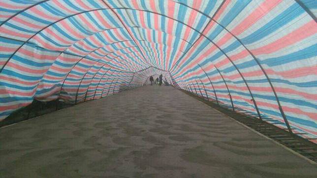 4月份,項目部進行了相當(dāng)一部分瀝青鋪設(shè)和大量的Fr5.0鋼筋混凝土澆筑,現(xiàn)場生產(chǎn)如火如荼。但是,武漢在這一時間段內(nèi)也進入雨季,連日的大雨給施工帶來了非常不利的影響,給瀝青攤鋪和混凝土澆筑造成了嚴重的阻礙。在這種天氣下,項目部決策果斷,下令制造雨棚,保證混凝土及時養(yǎng)護,也給現(xiàn)場作業(yè)提供了寶貴的時間也給項目按期完工提供了有力保障。